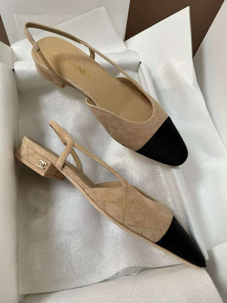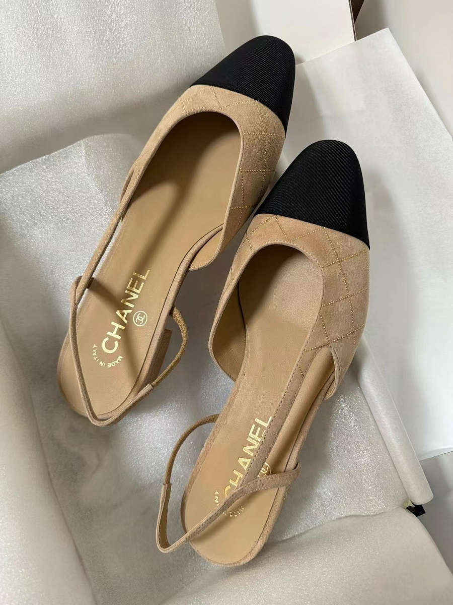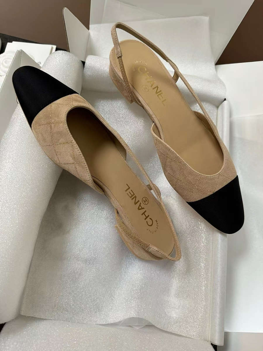 An icon of timeless Parisian elegance, the Chanel Beige & Black Slingback Pumps feature quilted suede with a contrasting black toe cap. Designed with a flattering slingback strap and sleek silhouette, these pumps are the ultimate wardrobe classic for day-to-night sophistication.