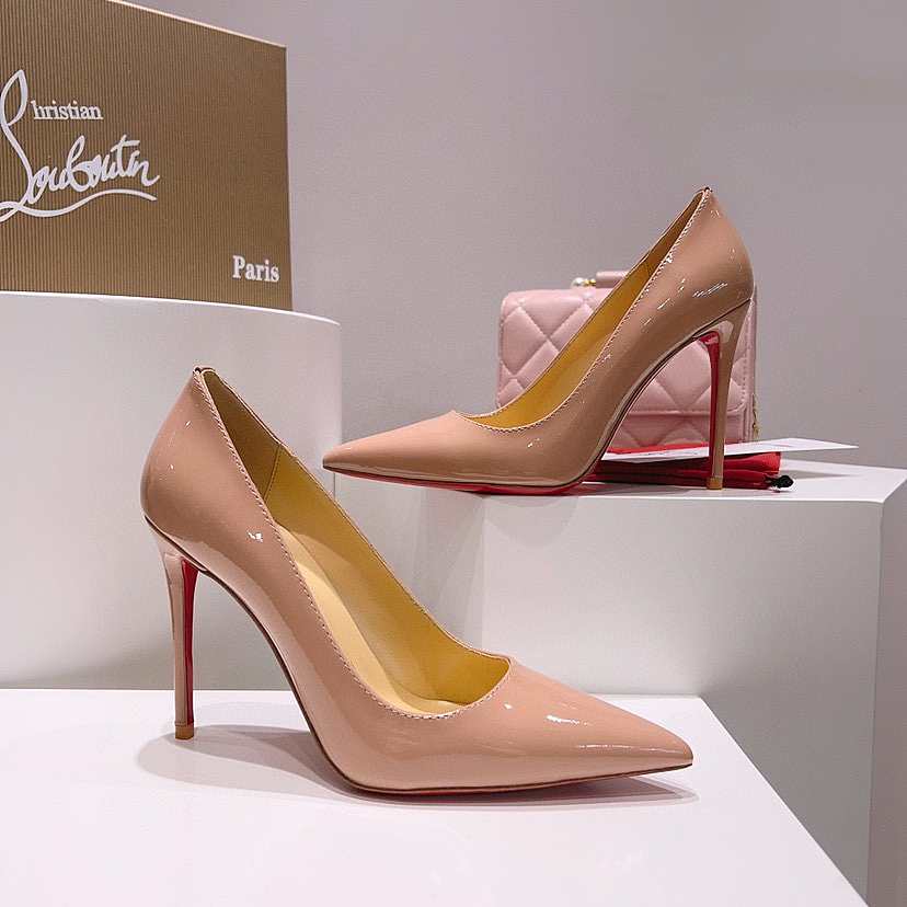 The Christian Louboutin So Kate 110mm Pump in beige patent leather embodies timeless elegance and sensual allure. Designed with a sleek pointed toe and high stiletto heel, this iconic pump elevates any look with its flattering silhouette and the signature red lacquered sole.